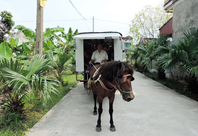 | Người dân xã Đoàn Đào đã quen với tiếng vó ngựa, tiếng còi bim bim mỗi khi chiếc xe ngựa của ông Khánh đi qua. |