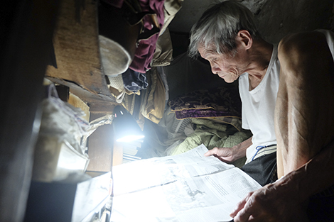 | Ông Cao đọc báo trong căn phòng 2m2. |