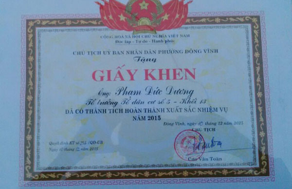 Điều tự hào hơn cả là trước đây khu dân cư số 5 là nơi thường xuyên tụ tập chích hút của các đối tượng nghiện ngập, trộm cắp nhưng kể từ khi anh Dương lên làm tổ trưởng, tình hình an ninh trật tự ổn định hơn hẳn. Đó cũng là nhờ những đề xuất có hiệu quả của anh với Đội An ninh, Ban bảo vệ dân phố, Công an phường Đông Vĩnh trong việc ngăn chặn, phòng chống các loại tội phạm.