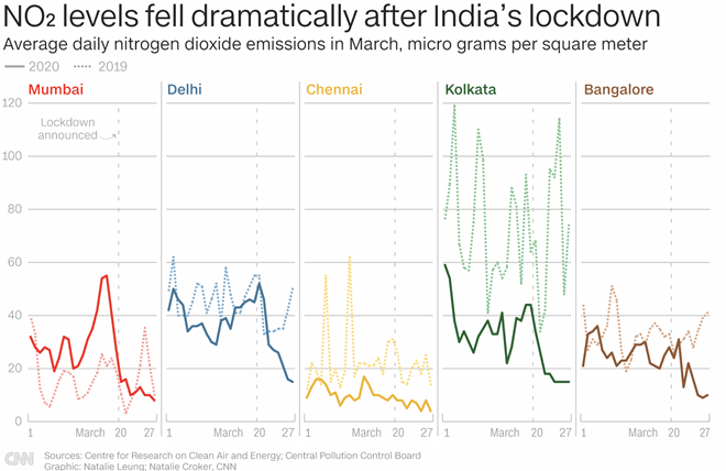 Dữ liệu từ Ủy ban kiểm soát ô nhiễm trung ương (CPCB thuộc Bộ Môi trường Ấn Độ cho biết, lượng khí NO2 tại New Delhi đã giảm từ 52 xuống 15 microgram/m3 trong tuần từ 20 đến 27/3. Mumbai, Chennai, Kolkata và Bangalore cũng đã ghi nhận sự sụt giảm nồng độ các chất gây ô nhiễm không khí tương tự.