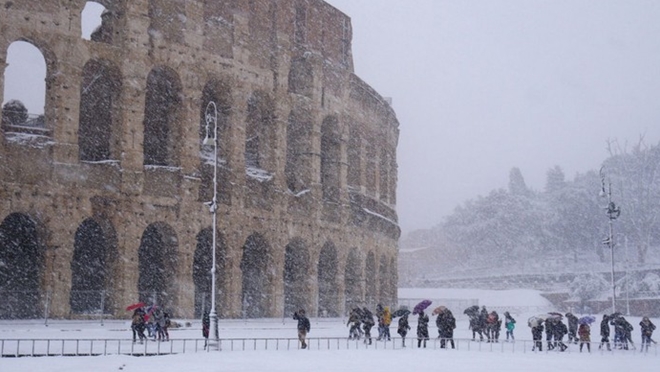 | Tại thủ đô Rome của Italy, tuyết rơi dày khiến các hoạt động giải trí đình trệ nghiêm trọng. Các đoàn tàu cũng phải ngừng hoạt động vì đầu máy và đường ray đều bị tuyết bao phủ. |