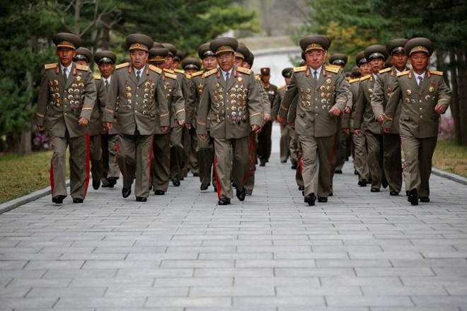 | Các cựu sĩ quan quân đội đến thăm nơi sinh của nhà sáng lập Triều Tiên - lãnh tụ Kim Il Sung. Ảnh: Reuters |