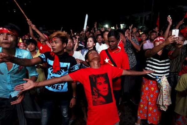 | Những người ủng hộ đảng NLD ăn mừng trước chiến thắng của đảng này. Ảnh: AP. |