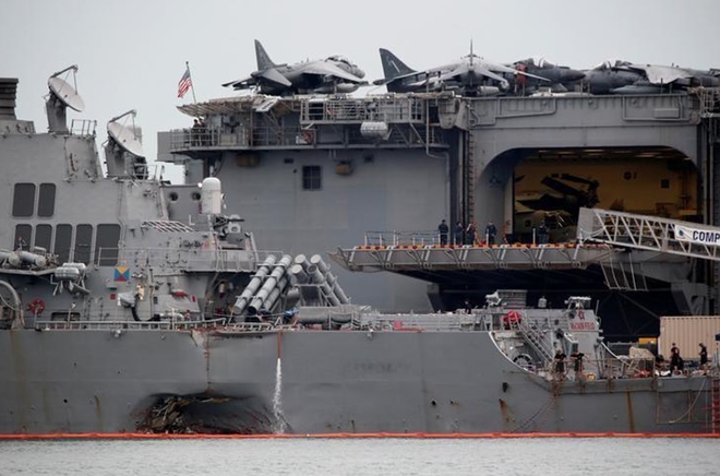 | Tàu khu trục USS John MccCain bị hư hỏng nặng sau cú va chạm với một tàu hàng ở vùng biển phía Đông Singapore và Malaysia hôm 21-8. Ảnh: Reuters |