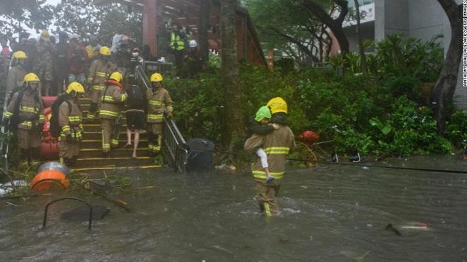 | Đội cứu hộ và sơ tán Hongkong làm việc 24/24 để trợ giúp người dân bị mắc kẹt đến địa điểm sơ tán an toàn. Theo báo cáo, có khoảng 100 người được ghi nhận bị trọng thương do bão Mangkhut. |