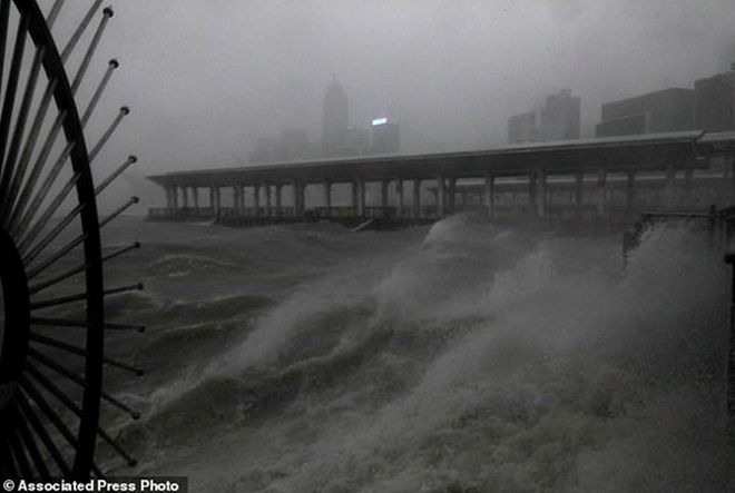 | Những đợt sóng con đến 4m dồn dập ập vào cảng Victoria của Hongkong. |