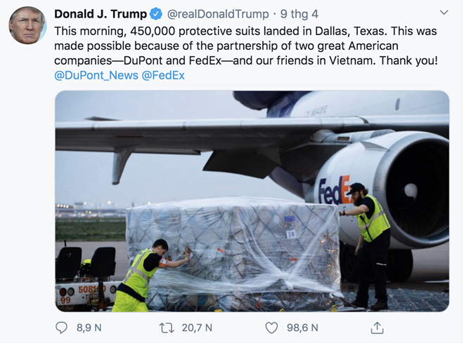 Trên trang Twitter cá nhân của mình ngày 9/4, Tổng thống Mỹ Donald Trump đã gửi lời cảm ơn tới Việt Nam và thông báo rằng chuyến hàng thứ nhất trong số hai lô hàng đầu tiên với hơn 450.000 bộ quần áo bảo hộ DuPont được sản xuất tại Việt Nam đã tới Dallas, bang Texas. Xem chi tiết tại đây