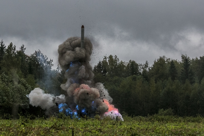 | Một tên lửa của Nga được khai hoả trong tập trận. Ảnh: TASS |