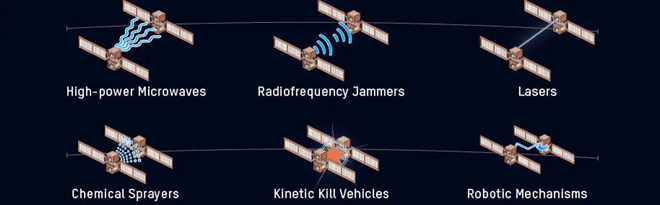 | Truyền thông Mỹ mô tả các hình thức một vệ tinh có thể phá hủy một vệ tinh khác như dùng sóng điện từ cường độ cao, gây nhiễu radio, dùng tia laser, phun chất hóa học, dùng cơ chế tự sát hoặc dùng cánh tay robot để phá hủy. |