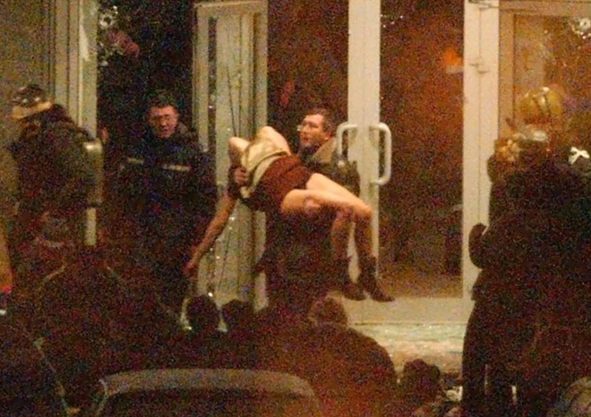 | Binh sĩ Nga đưa một nạn nhân ra khỏi nhà hát Dubrovka. Ảnh: ITN |