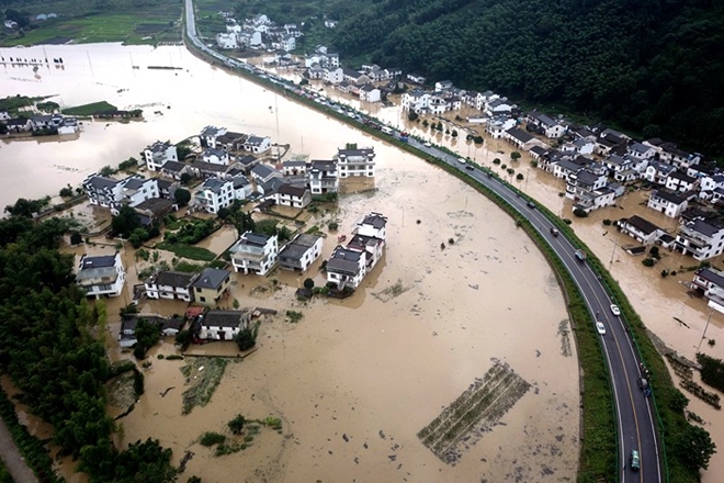 | Nhiều khu dân cư tại An Huy, Trung Quốc bị cô lập vì mưa lũ. Ảnh: Caixin Global |