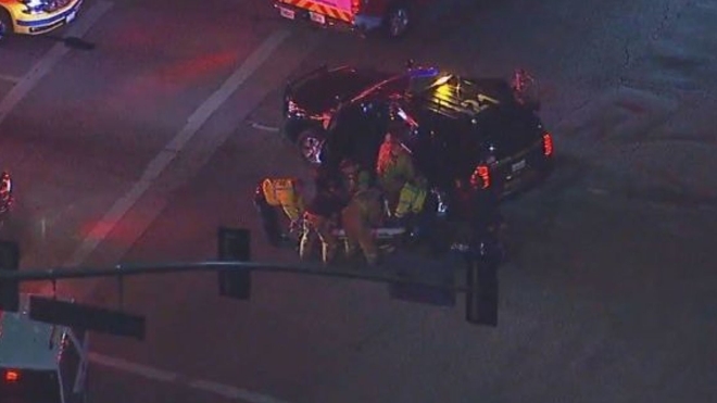 | Xe cứu thương, xe cứu hoả tại hiện trường vụ nổ súng. Ảnh: ITN |