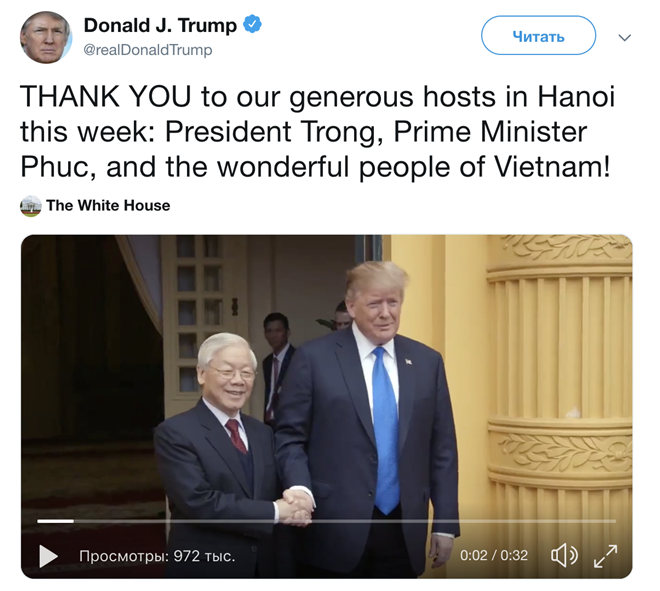 "CÁM ƠN tới những người chủ nhà hào phóng ở Hà Nội tuần này: Chủ tịch Trọng, Thủ tướng Phúc và những con người Việt Nam tuyệt vời", Tổng thống Mỹ Donald Trump đăng trên Twitter vài phút sau khi lên chuyên cơ Air Force One trở về Mỹ chiều 28-2.