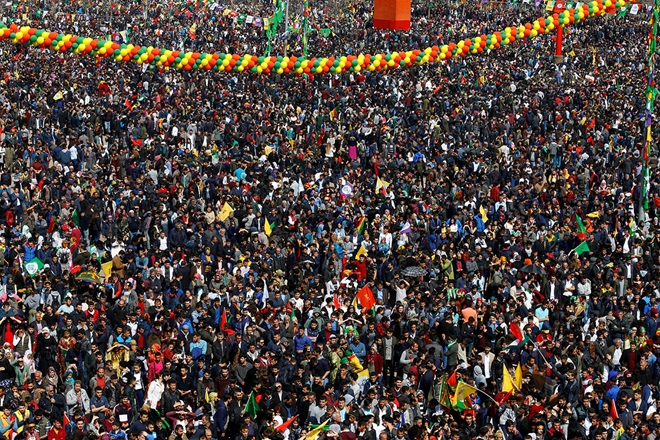 | Người Kurd tại Thổ Nhĩ Kỳ tập trung kín quảng trường tại thành phố Diyarbakır, thành phố lớn nhất của người Kurd để ăn mừng năm mới. Ảnh: Reuters |