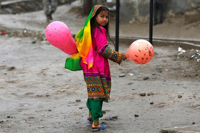 | Một bé gái Afghanistan thích thú với những quả bóng em nhận được trong ngày đầu năm mới. Ảnh: Reuters |