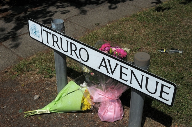 | Những bông hoa được đặt tại Truro Avenue, nơi vụ đâm xe xảy ra khiến một người đàn ông tử nạn. Ảnh: MEN |