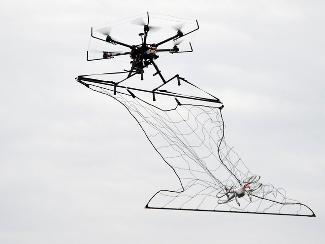 Theo BBC, năm 2016, Cảnh sát Nhật đã triển khai máy bay không người lái sử dụng lưới để bắt chiếc máy bay chứa một lượng lớn cát phóng xạ không gây hại khi nó hạ cánh xuống nóc tòa nhà của Thủ tướng Shinzo Abe - một hành động phản kháng của một nhà hoạt động chống hạt nhân. Loại máy bay không người lái này của Nhật có vẻ an toàn hơn rất nhiều so với giải pháp của Cảnh sát Quốc gia Hà Lan - họ huấn luyện đại bàng để đón hạ những vật thể bay trái phép.