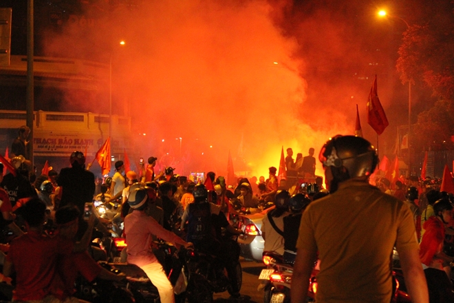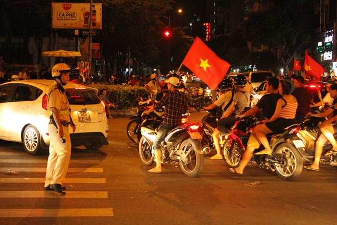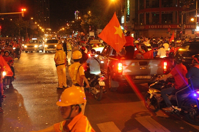 | Việc hàng trăm ngàn CĐV đội tuyển Việt Nam xuống đường làm một số tuyến đường bị ùn tắt cục bộ, CSGT phải điều động toàn bộ lực lượng đến các điểm nóng, các tuyến đường phân luồng, điều tiết giao thông nhằm giảm thiểu nạn ùn tắt. |