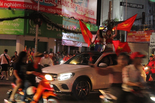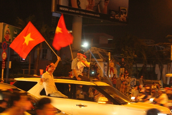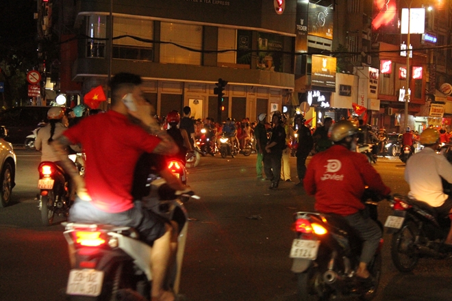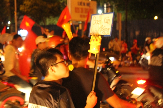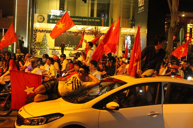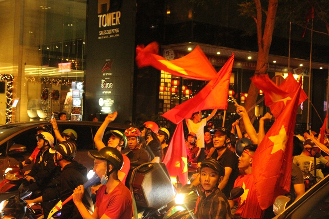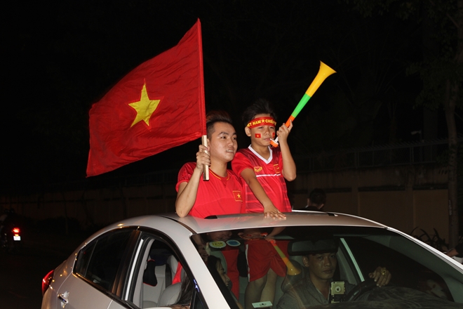 | Cầm cờ chạy xung quanh các tuyến đường, hò reo thể hiện vui mừng của các CĐV đội tuyển Việt Nam |