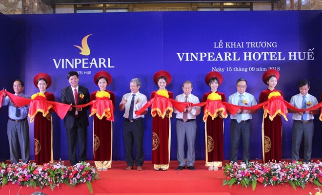 Đại diện lãnh đạo tỉnh Thừa Thiên- Huế và Công ty Cổ phần Vinpearl cắt băng khai trương khách sạn 5 sao quốc tế Vinpearl Hotel tại Huế. |