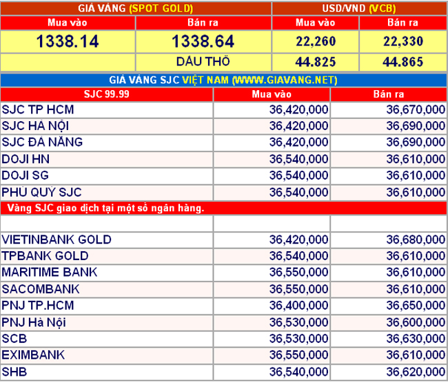 Tính đến 9h sáng hôm nay, ngày 15-8, giá vàng giao ngay đứng mức $1.338/oz.