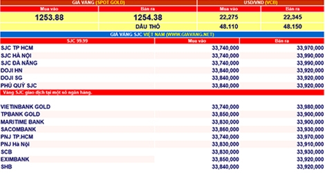 Tại thị trường trong nước, giá vàng SJC hôm nay, 23-5 giao dịch ở mức 33,74-33,97 triệu đồng/lượng.
