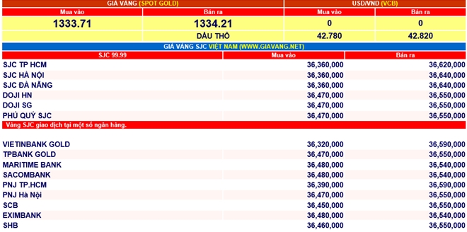 Ngược lại, giá bán vàng SJC hôm nay, 9-8, ra thị trường thấp nhất của các doanh nghiệp, đồng nghĩa với khách hàng có nhu cầu mua vàng sẽ có lợi nhất, ở mức 36,54 triệu đồng/lượng, tại bảng giá của Eximbank.