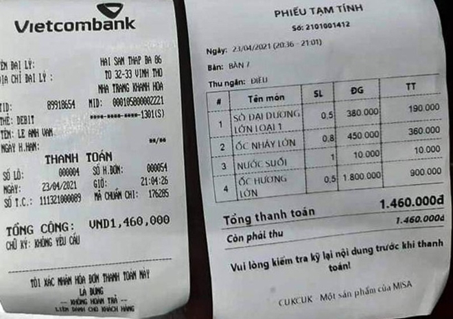| Ba đĩa ốc và tấm phiếu thu tiền của nhà hàng hải sản Bờ Kè Tháp Bà 86 được đưa trên mạng xã hội |