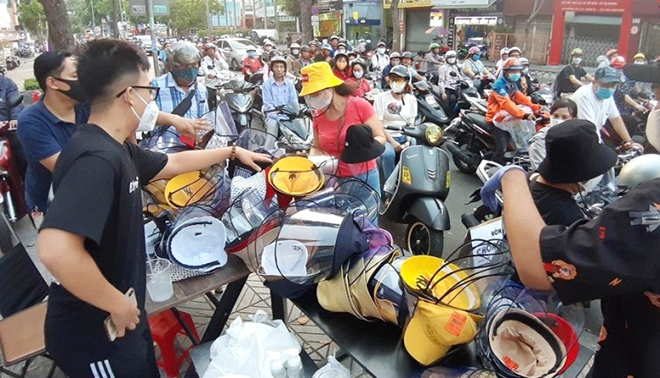 Trong những ngày qua, tại nhiều tuyến đường trên địa bàn TP Hồ Chí Minh như: Xuất hiện nhiều điểm bán “Nón che mặt chống virus COVID-19” hoặc “Nón chống virus bảo vệ cộng đồng. Theo ghi nhận, tại các điểm bán gần như lúc nào cũng đông khách hàng đến lựa chọn, ngã giá. Loại nón này có hình dáng, mẫu mã đa dạng như các loại nón vải, nhưng kết cấu của sản phẩm gồm 2 phần. Phần trên là một chiếc nón vải thông thường được kết nối với phần dưới là một tấm chắn mỏng bằng nhựa trong suốt có chiều dài qua mũi, bề ngang bao phủ hết toàn bộ khuôn mặt của người sử dụng.