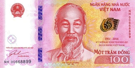 Tờ tiền lưu niệm có kích thước to hơn so với các tờ tiền polymer thông thường, chất liệu bằng cotton màu sắc đỏ. Mặt trước là hình quốc huy, chân dung Chủ tịch Hồ Chí Minh, dòng chữ Ngân hàng Nhà nước Việt Nam, mệnh giá 100 đồng in đậm với logo 65 năm kỷ niệm thành lập NHNN.