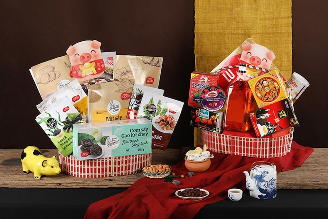 Đặc biệt, tại VinMart & VinMart+ còn có giỏ quà Tết "Sum vầy" với mức giá 399.000 đồng, bao gồm các sản phẩm VinMart Good hàng tốt, giá tốt như cơm sấy, trái cây sấy, hạt nêm, snack rong biển…phù hợp với nhu cầu biếu tặng thông thường và các giỏ quà kết hợp sản phẩm VinMart Good, VinMart Home với một số thương hiệu khác, mang tới mức giá hợp lý chỉ từ 199.000 đồng.
