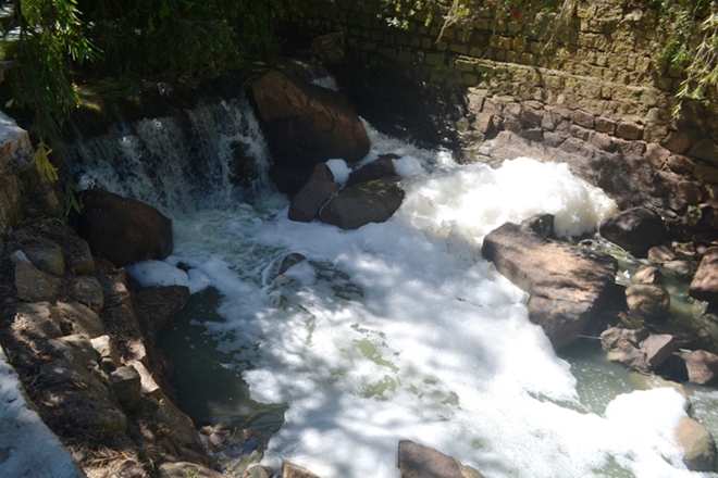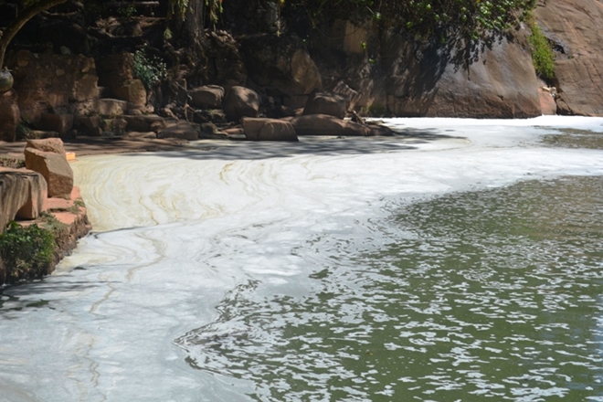Vừa vào tới dòng thác đang nổi bọt trắng xóa vì ô nhiễm, họ đã không thể chịu được mùi hôi mạnh bốc lên từ dòng nước đen ngòm. Người nheo mặt, người dùng tay bịt mũi, cả đoàn lộ rõ sự thất vọng nặng nề. Họ ra hiệu cho nhau lặng lẽ đi ra ngoài, trả lại không gian cho tiếng nước róc rách và từng mảng bọt đang nổi trắng xóa. |