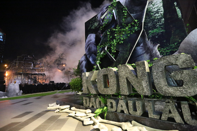 18h ngày 9/3, tại Trung tâm thương mại trên đường Nguyễn Văn Linh (quận 7, TP HCM) diễn ra lễ công chiếu bộ phim "Kong: Skull Island". Trong ảnh: mô hình King Kong cao khoảng 5 m được dựng giữa bối cảnh sân khấu chính trước vụ hỏa hoạn. Chương trình thu hút hàng trăm khách mời.