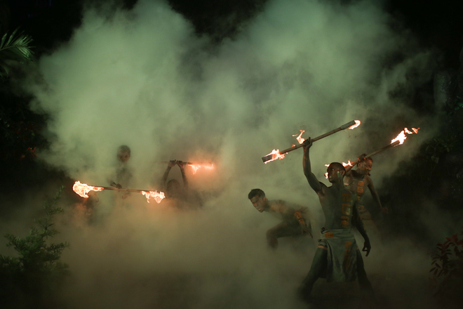 Phần mở đầu buổi công chiếu là tiết mục biểu diễn với lửa của dàn vũ công hóa thân thành các thổ dân.