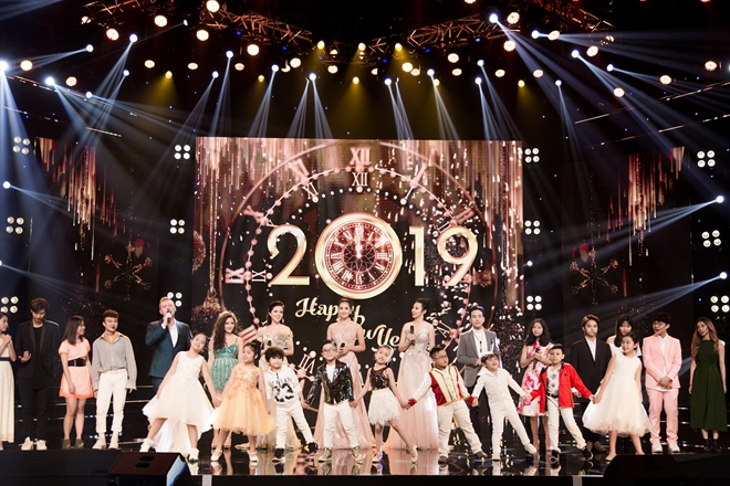 | Kết chương trình, 4 người đẹp cùng các ca sĩ và em nhỏ hát vang ca khúc “Happy New Year” để chào đón giây phút năm mới đang đến. |