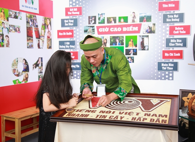 | Bức tranh gạo ấn tượng của VOV "hút" sự chú ý đặc biệt của các em nhỏ. |