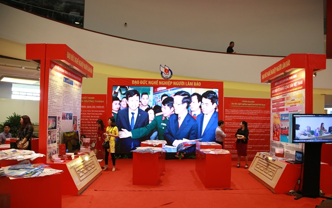 | Góc trưng bày của Hội Nhà báo Việt Nam. Chủ đề của Hội báo Toàn quốc 2018 là "Báo chí Việt Nam đồng hành cùng đất nước đổi mới". Đây là dịp tôn vinh sự phát triển mạnh mẽ, những thành tích to lớn của Báo chí Việt Nam, quảng bá những sản phẩm báo chí gắn với hoạt động lao động, sáng tạo của các nhà báo trong cả nước. |