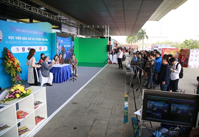 | Góc trưng bày của Học viện Báo chí và Tuyên truyền. Đây là điểm dừng chân lý tưởng của các bạn sinh viên báo chí, nơi diễn ra các talkshow với nhiều chuyên gia "gạo cội" về báo chí. |