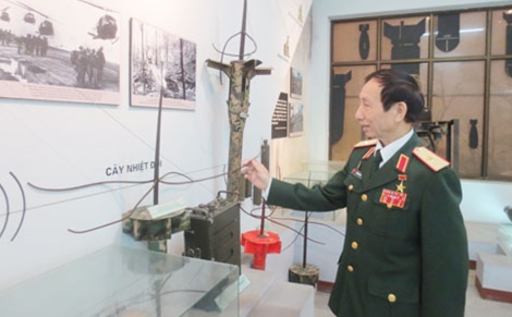 | Thiếu tướng Nguyễn Bá Tòng bên hiện vật “cây nhiệt đới” lưu giữ tại Bảo tàng Đường Hồ Chí Minh. |