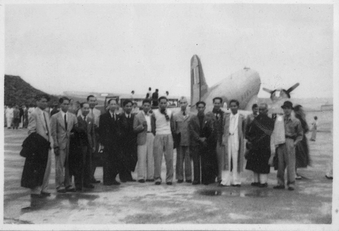 | Một hình ảnh tại triển lãm: Phái đoàn Quốc hội Việt Nam khóa I tại sân bay Gia Lâm, Hà Nội trước giờ khởi hành đi Paris. |