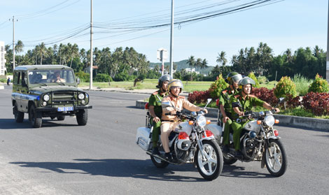 | Một tổ công tác của Công an thị xã Sông Cầu tuần tra bảo vệ an ninh trật tự. |