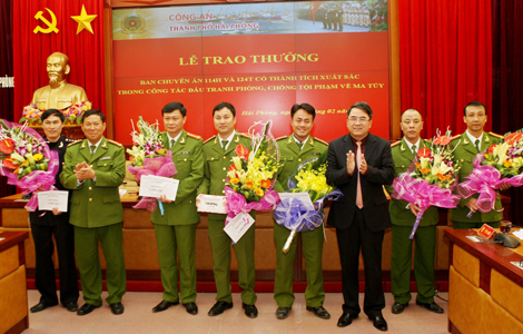 | Đại diện Phòng PC47 Công an TP Hải Phòng nhận quyết định khen thưởng trong một chuyên án. |