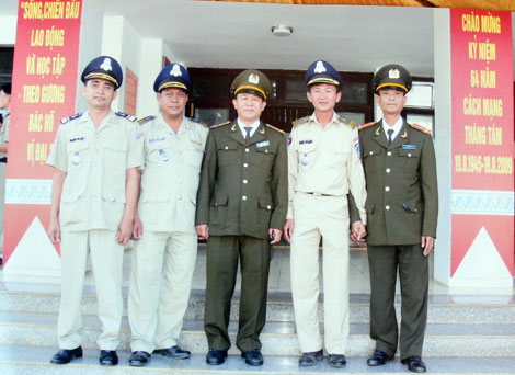 | Đại tá K'Tiêng (giữa) với cán bộ, chiến sĩ Công an tỉnh Đắk Lắk. |