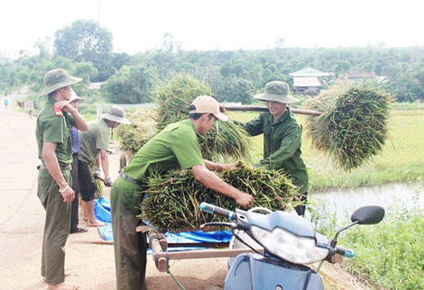 | và giúp dân thu hoạch lúa hè thu sau bão số 10. |