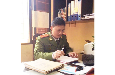 | Thiếu tá Hoàng Ngọc Quang đang nghiên cứu hồ sơ một vụ án. |