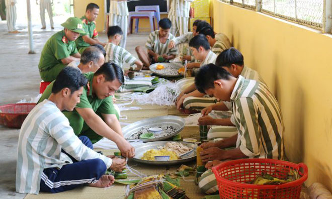 | Các phạm nhân ở Trại giam Mỹ Phước, Tiền Giang cùng các quản giáo gói bánh tét chuẩn bị đón Tết. |