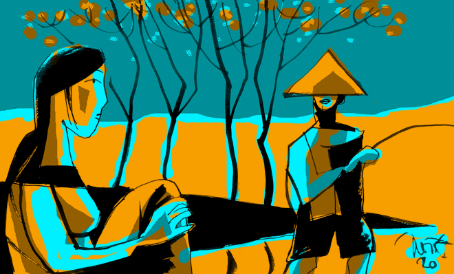 Thằng Sơn, bạn từ thời cởi truồng tắm mưa cùng tôi, cũng trượt đại học. Đôi mắt nó rất to và tròn. Nhưng rồi, nó cũng lận đận như tôi. Biết tôi buồn, nó thường sang thăm tôi và không quên mang theo những món quà nho nhỏ, khi thì chùm ổi rừng chua ngọt, lúc thì đóa sim tím dịu dàng. Thi thoảng, nó còn giúp ngoại tôi hái lá me chua nấu canh rô đồng rồi ở lại ăn cơm cùng. Trong bữa cơm, nó luôn tay gắp thức ăn vào bát tôi và liến thoắng bông đùa để tôi vui. Có lần, tôi phì cười, suýt phụt cơm vào mặt nó. Ngoại dặn tôi là con gái phải biết giữ ý tứ mới lấy được chồng. Sơn chữa cháy ngay, nếu chả con ruồi nào thèm bu cháu gái của bà thì để cháu xung phong chống ế cho ạ. Tôi đặt bát cơm đấm vào lưng thằng Sơn thùm thụp. Nhìn hai đứa trêu chọc nhau, ngoại cười hiền hậu, hai đứa mày mà lấy nhau rồi hàng xóm phải mua bông nhét vào lỗ tai bảo vệ màng nhĩ.