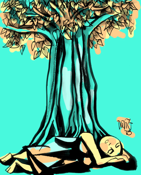 Lúc tỉnh dậy tôi thấy mình đang nằm bên chiếc chõng tre nhỏ đặt ở gốc cây bồ đề bóng tỏa sum sê. Đầu óc tôi nhẹ bẫng, cảm giác như những hình ảnh trong giấc mơ đang thoát ra khỏi khối óc, bầy chim trên tán cây bồ đề cặp từng kỉ niệm bay đi mất. Điều đáng ngạc nhiên là trong vườn chùa có rất nhiều chõng tre, một vài người cũng đang ngủ một giấc trưa giống như tôi.