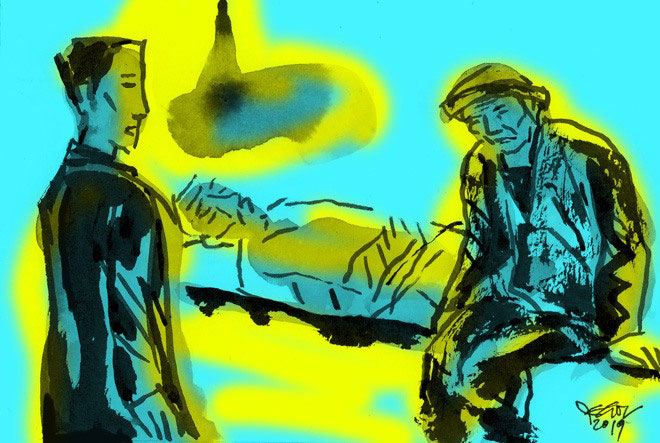 Ông Khánh hàng xóm bước lại cạnh giường, ông đẩy lưng ông Tuấn dịch sang bên và giơ ngón tay trỏ lên miệng ra hiệu cho mọi người im lặng. Ông Khánh nghiêng đầu, mồm ha há và đôi chân mày của ông nhiu nhíu. Ông Khánh đang cố gắng để có thể lĩnh hội được đôi môi mấp máy kia phát ra âm thanh gì. Rất khó đoán được thành ý chứ nói gì đến đoán thành một câu nói. Mọi người đứng súm sít, yên ắng cùng chờ đợi.
