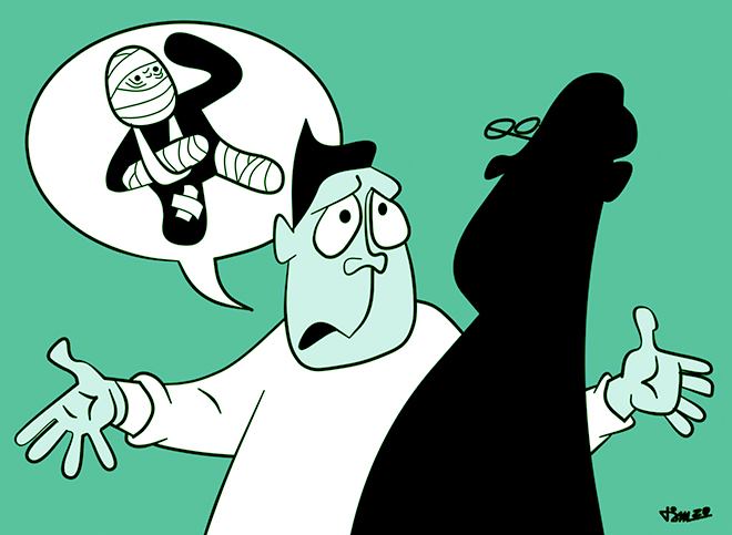 Ngày hôm sau, Tiểu Vương lại nói rằng bố anh lại bị tai nạn. Anh ta giải thích: "Thực ra, hôm qua bố tôi bị gãy xương nhưng ông nhịn đau không nói, đến nửa đêm thì đau quá không chịu được nên tôi phải đưa ông đến bệnh viện".